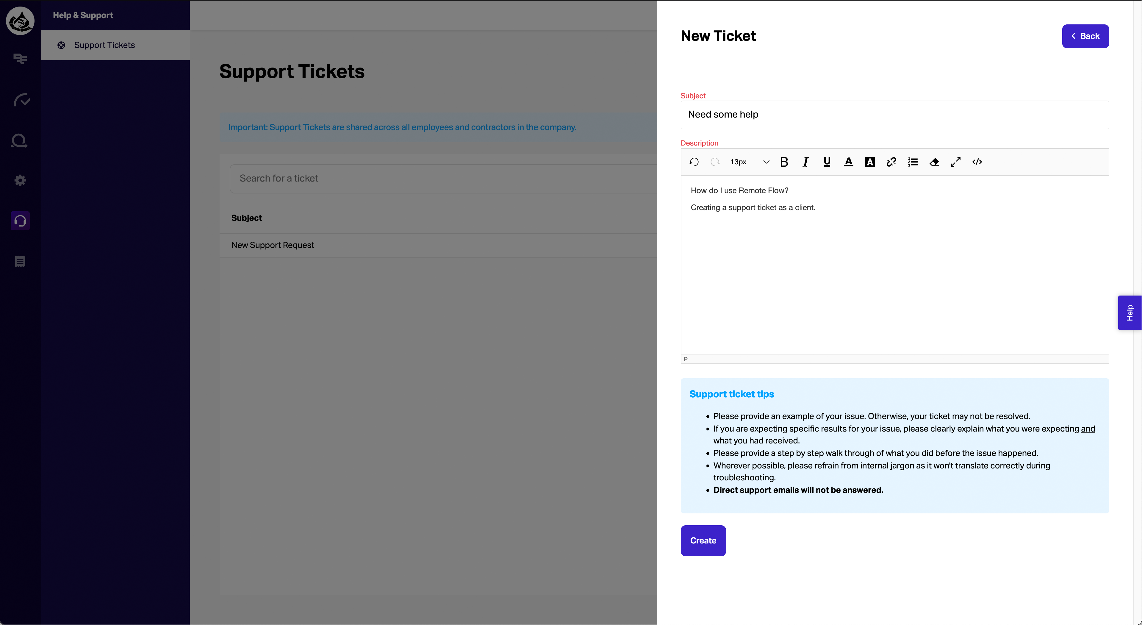 The user will be able to create Support Tickets, which will be sent to Zendesk.