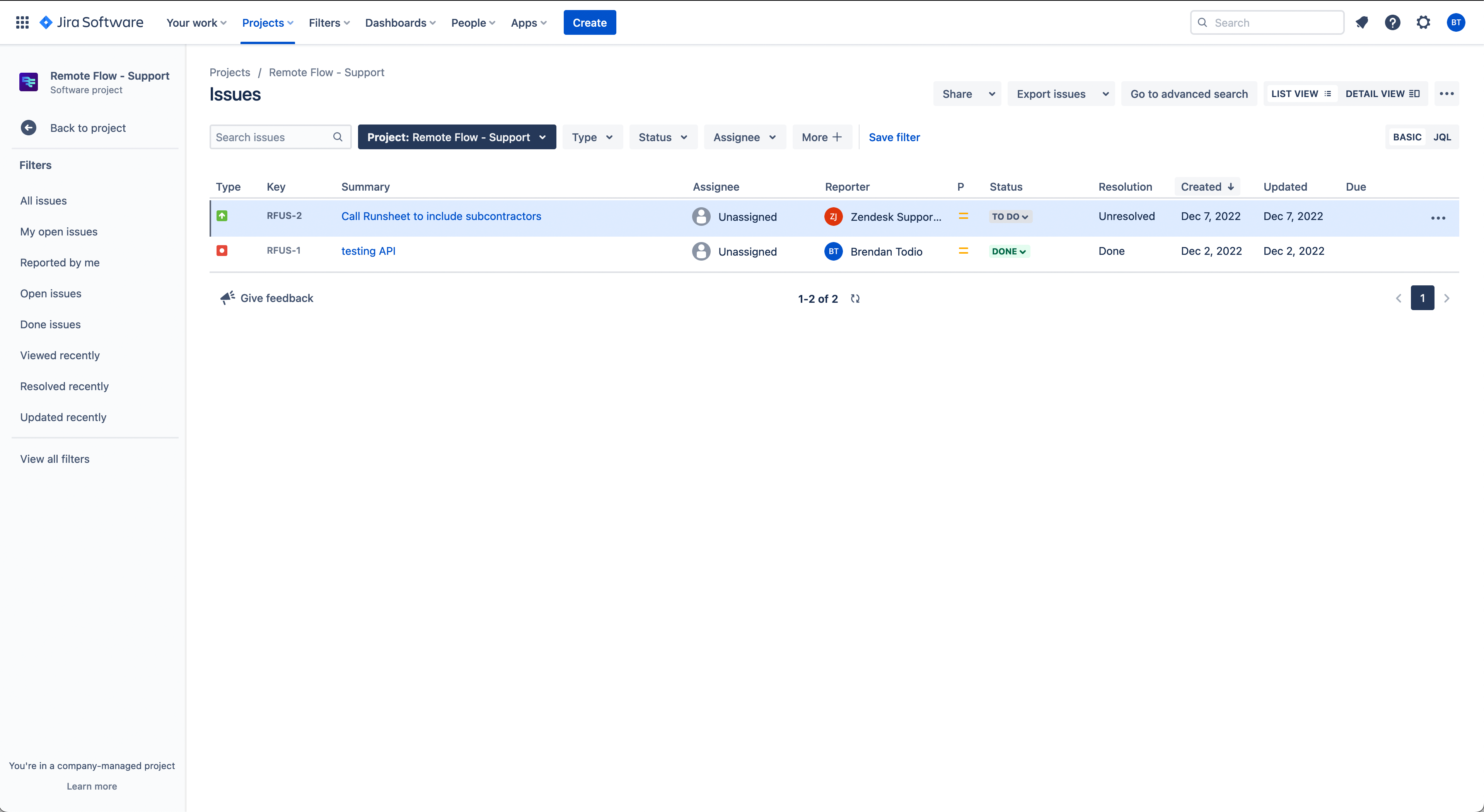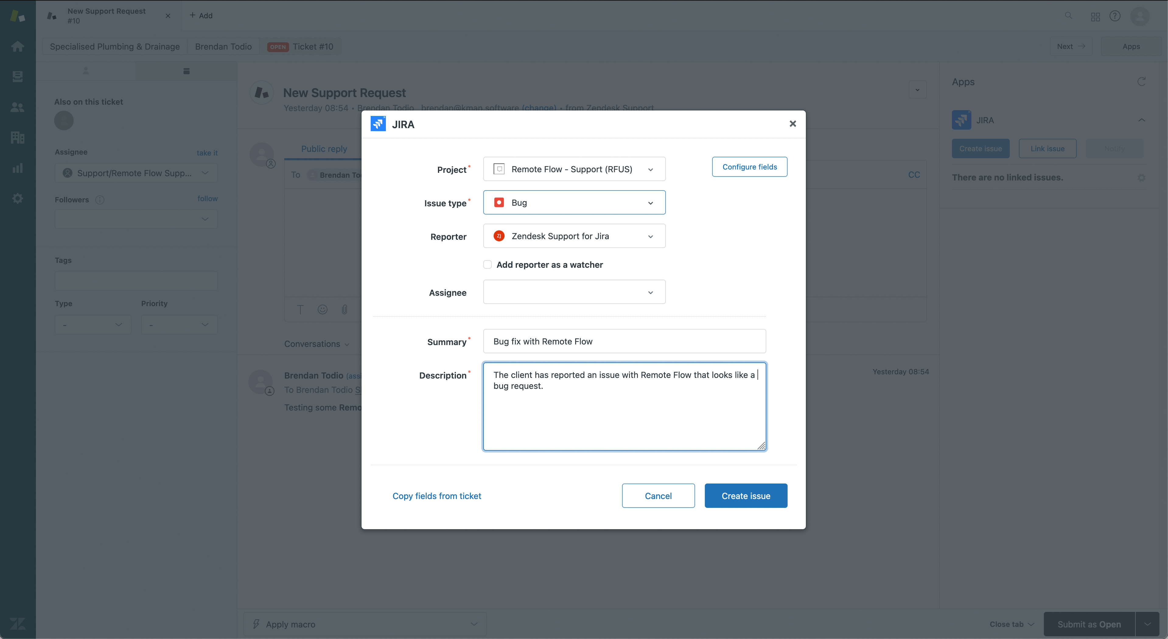 When a support ticket cannot be resolved without a developer, a JIRA ticket can be raised from the Zendesk ticket window.